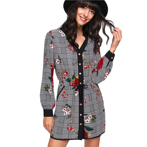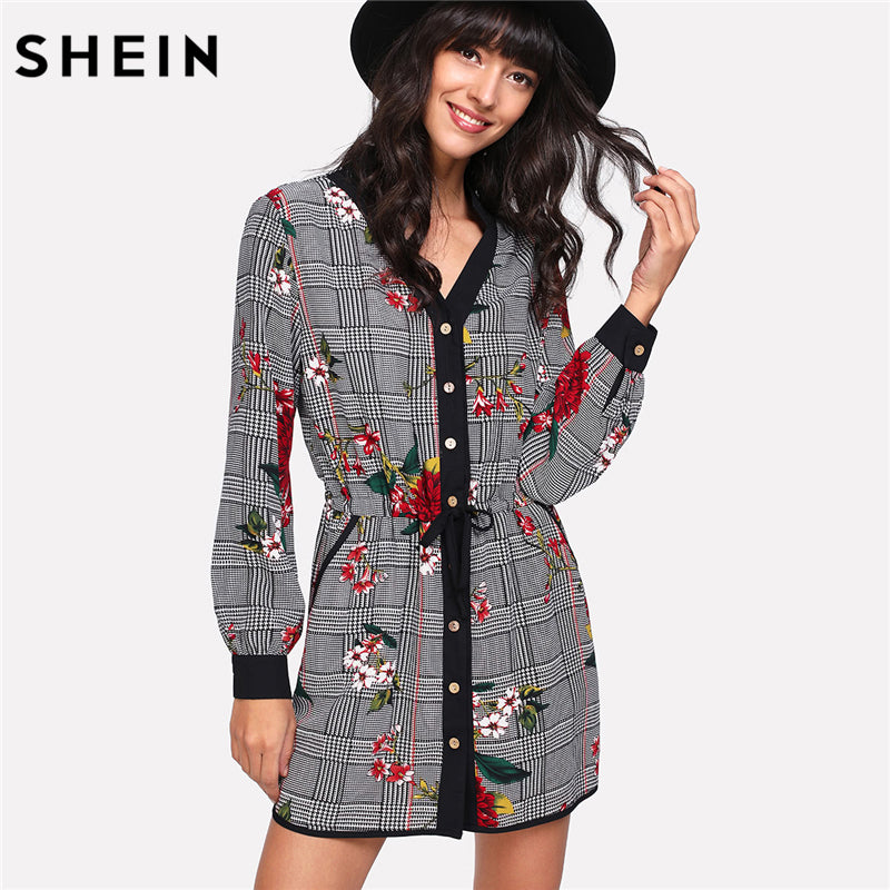SHEIN Casual Dress Multicolor Long Sleeve V Neck Floral Dress Contrast Trim Drawstring Waist Mixed Print Shirt Dress